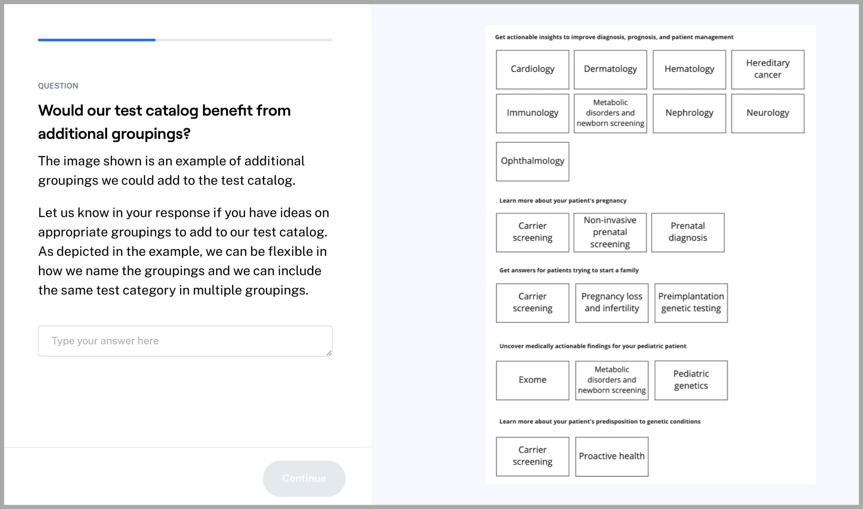 We grouped the test categories into how they are in our system today then translated these grouping names into straightforward language. We wanted to stay away from medical terminologies and use plain language.